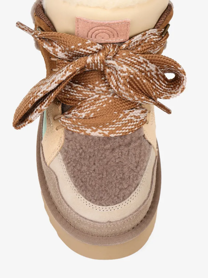 Sneakersy na platformie z wielobarwnego połączenia zamszu i tkaniny imitującej futro baranka.