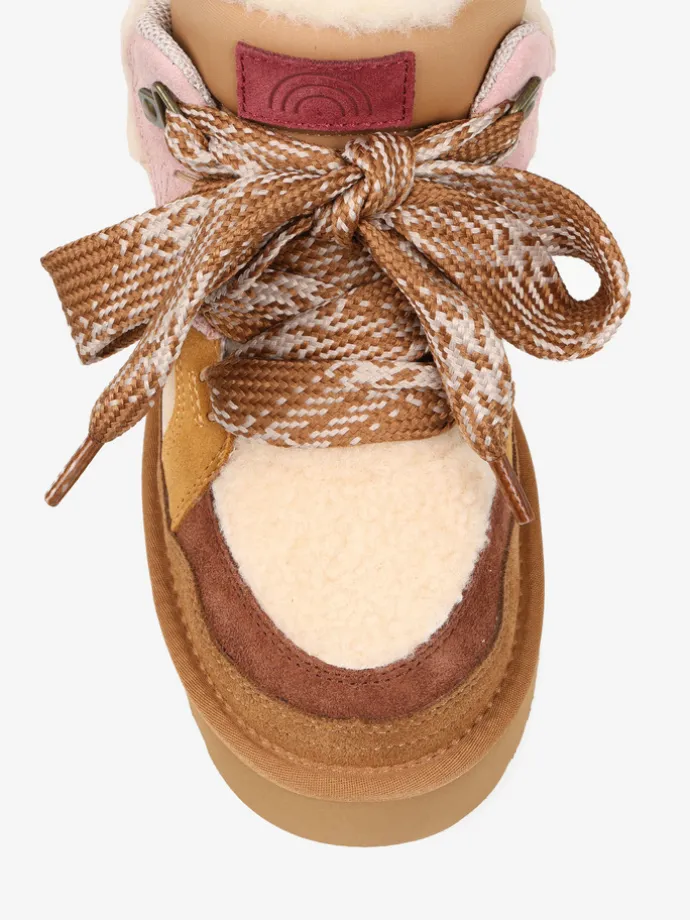 Sneakersy na platformie z wielobarwnego połączenia zamszu i tkaniny imitującej futro baranka.