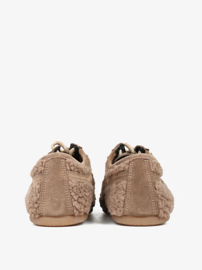 Miękkie, lekkie, beżowe sneakersy wykonane z zamszu i tkaniny imitującej futro baranka.