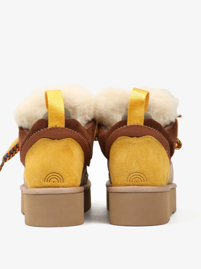 Sneakersy na platformie z wielobarwnego połączenia zamszu i tkaniny imitującej futro baranka.