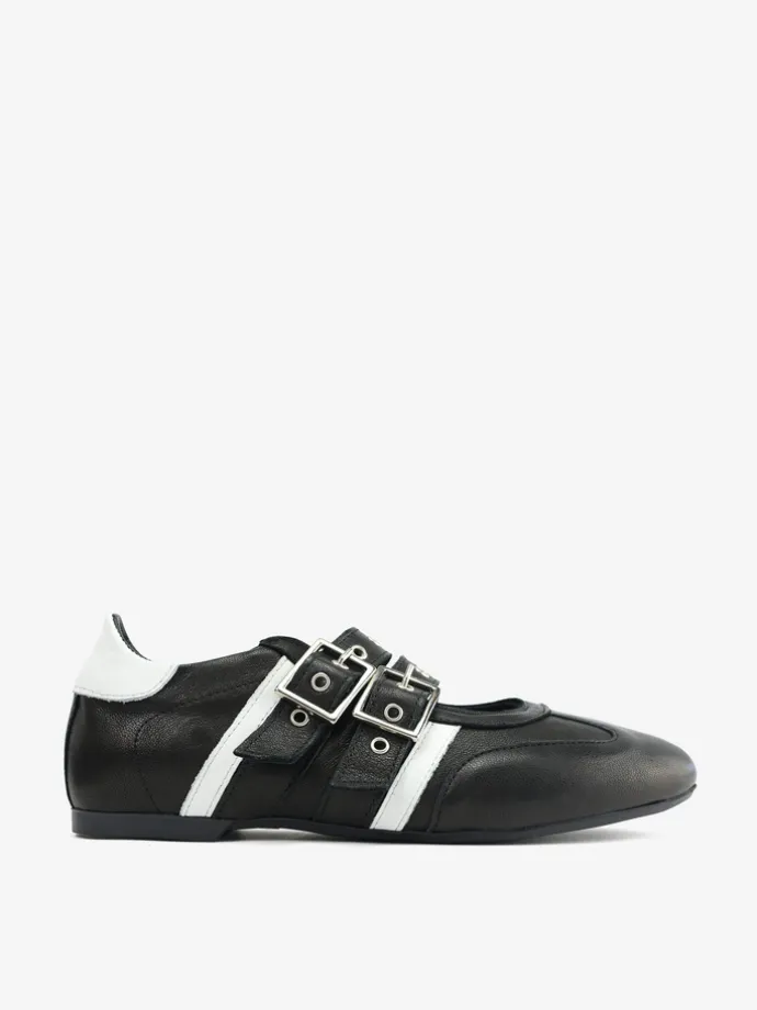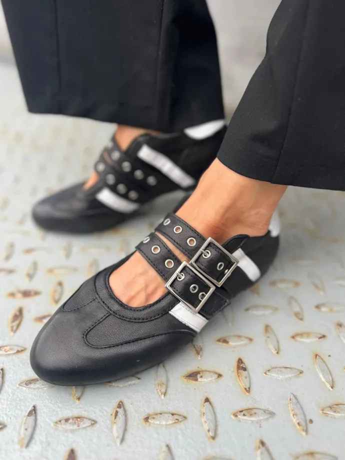 Skórzane sneakersy z głębokim wycięciem, dwoma regulowanymi paskami i białymi przeszyciami.