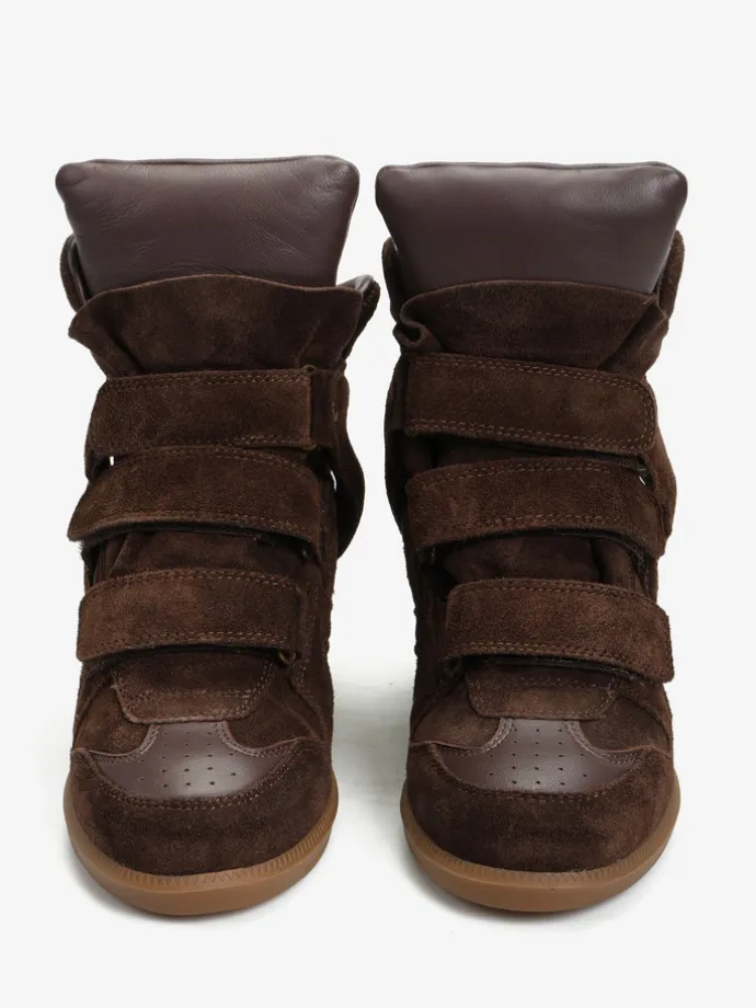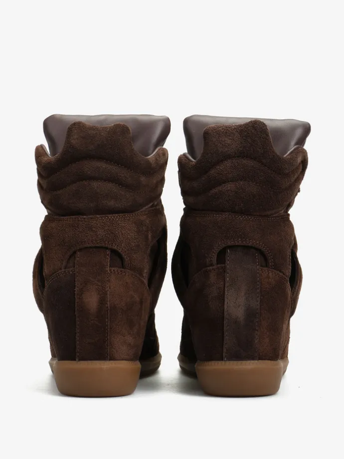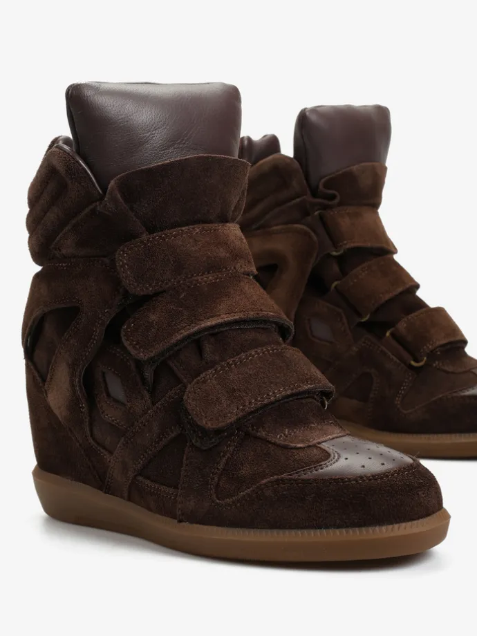 Zamszowe sneakersy z ukrytym koturnem (ok. 5 cm). Zapięcie na rzepy i miękki język ze skóry licowej.