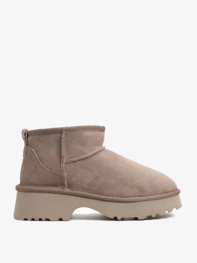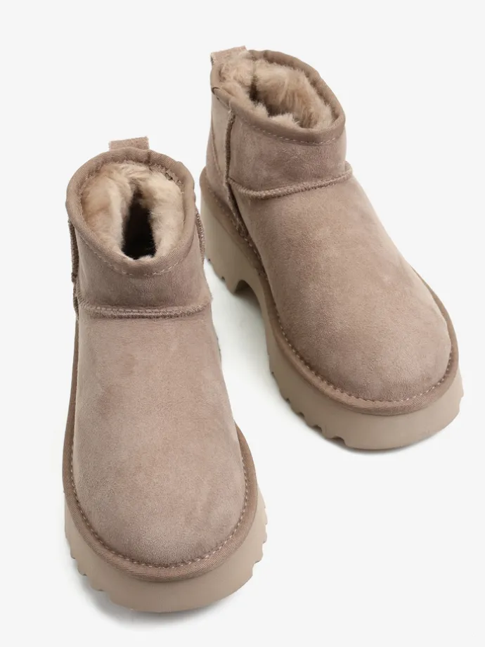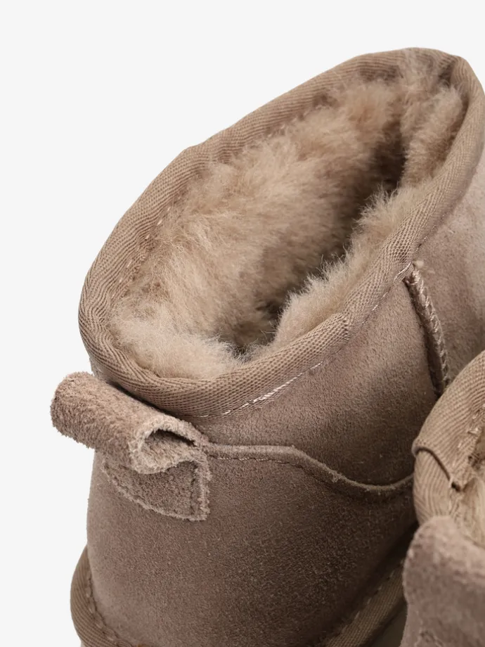 Krótkie śniegowce na wyprofilowanej platformie, wykonane z 100% naturalnej skóry owczej. Zewnętrzna warstwa to miękka, zamszowa skóra, natomiast wnętrze to ciepły, naturalny kożuch.