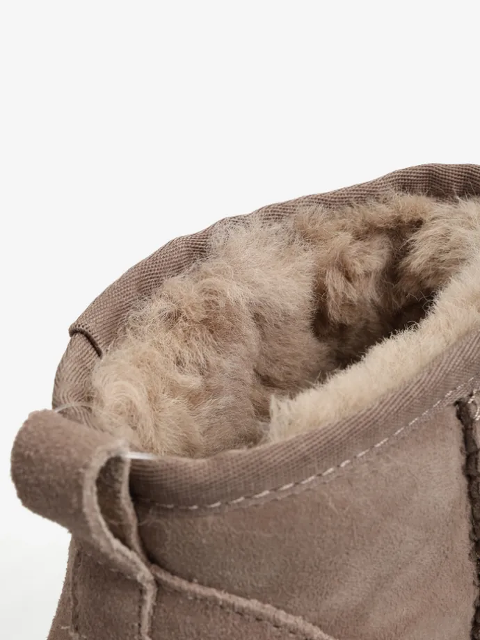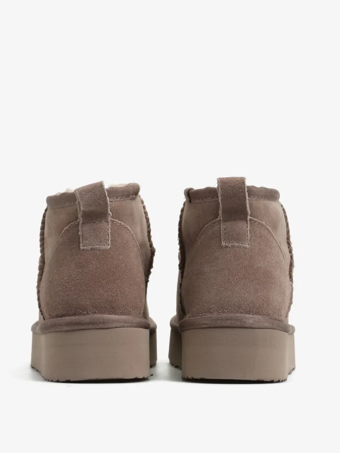 Krótkie śniegowce na średniej platformie, wykonane z 100% naturalnej skóry owczej. Zewnętrzna warstwa to miękka, zamszowa skóra, natomiast wnętrze to ciepły, naturalny kożuch.