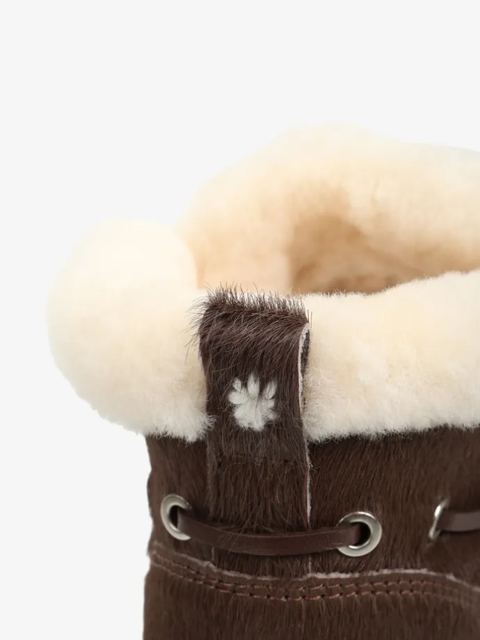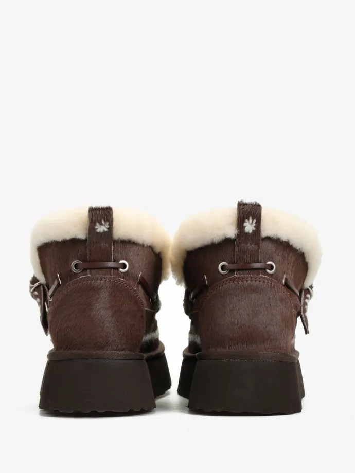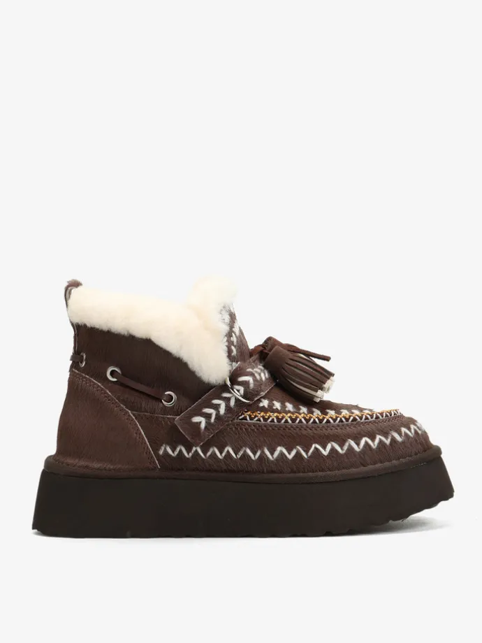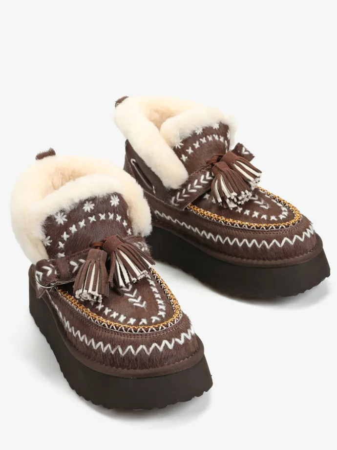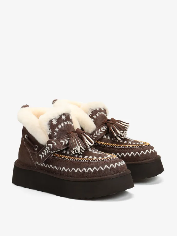 Śniegowce na wysokiej platformie wykonane z naturalnej skóry z włosiem. Ozdobne hafty i regulowany pasek z frędzlami. Wnętrze wyłożone miękką, naturalną wełną owczą.