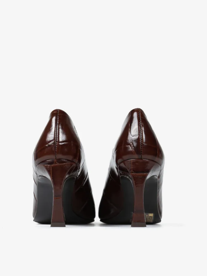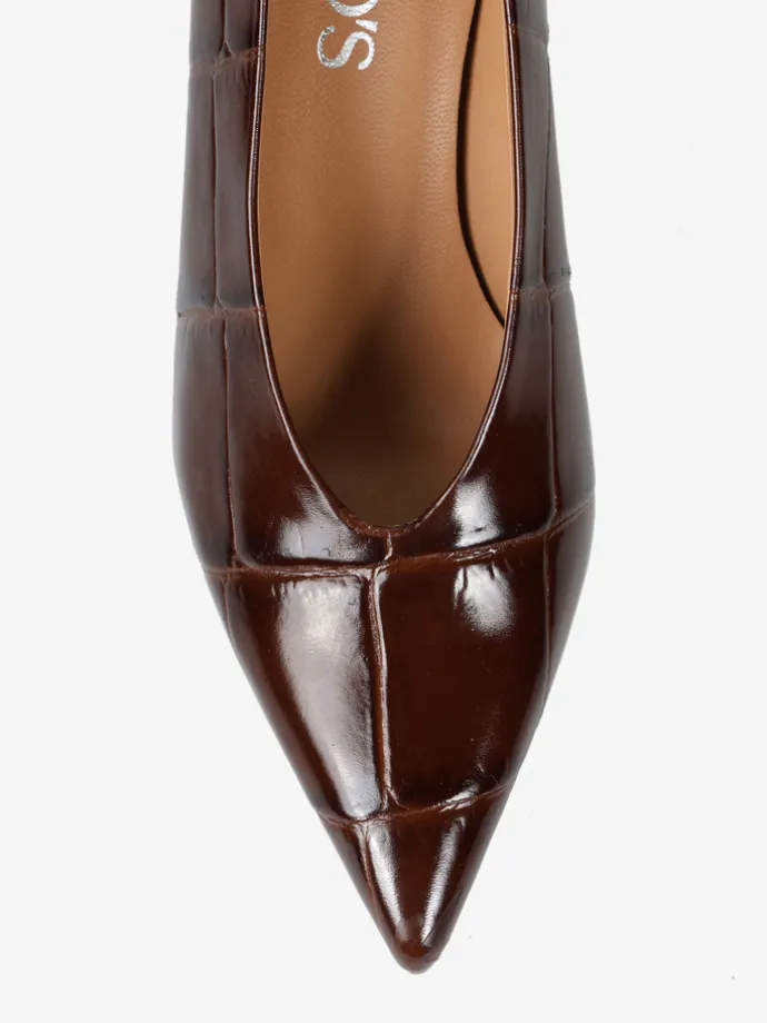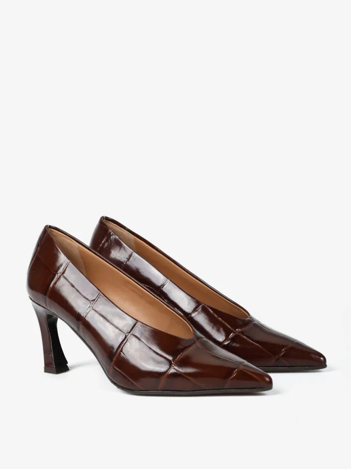 Szpilki z noskiem w szpic, wykonane ze skóry tłoczonej w krokodyli wzór. Owalne wycięcie z zabudowanymi brzegami.