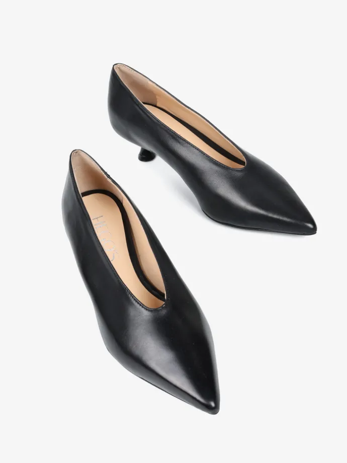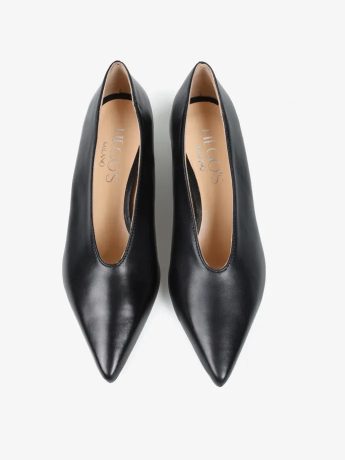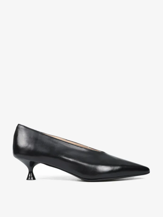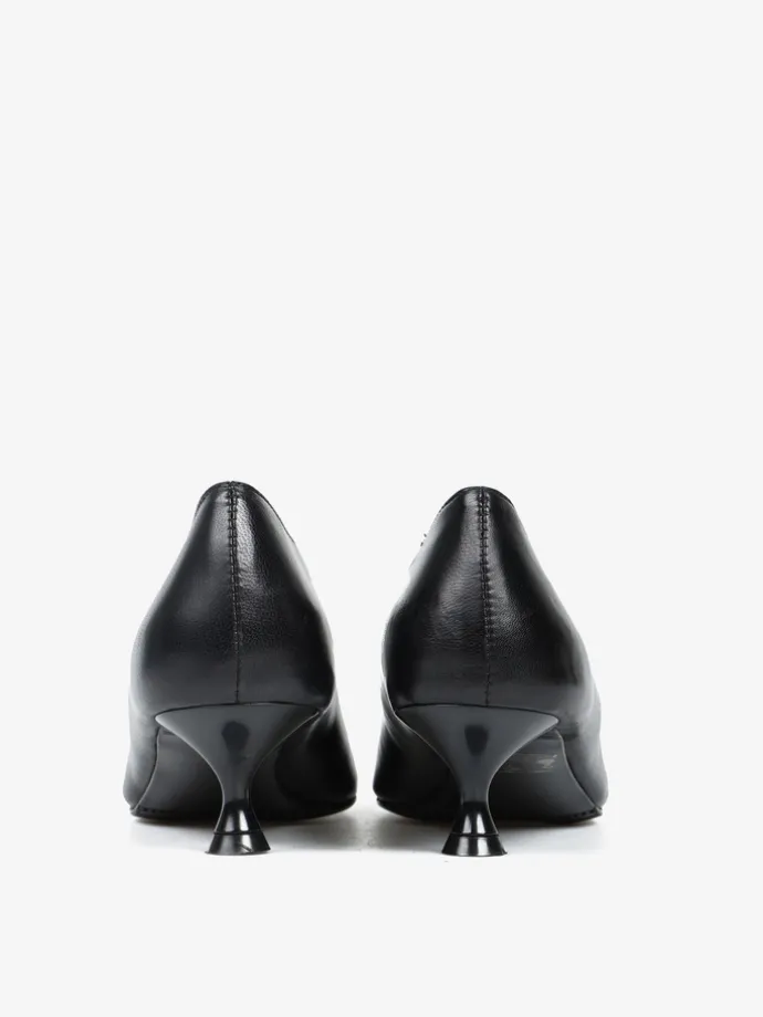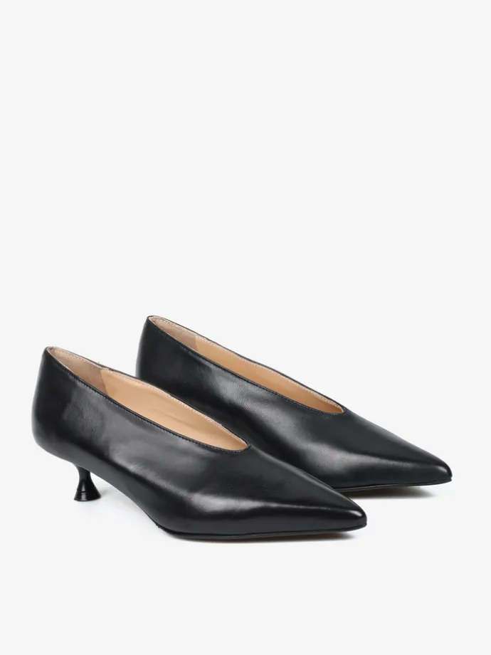 Niskie szpilki wykonane z miękkiej i delikatnej skóry. Noski w szpic i owalne wycięcia z zabudowanymi brzegami.