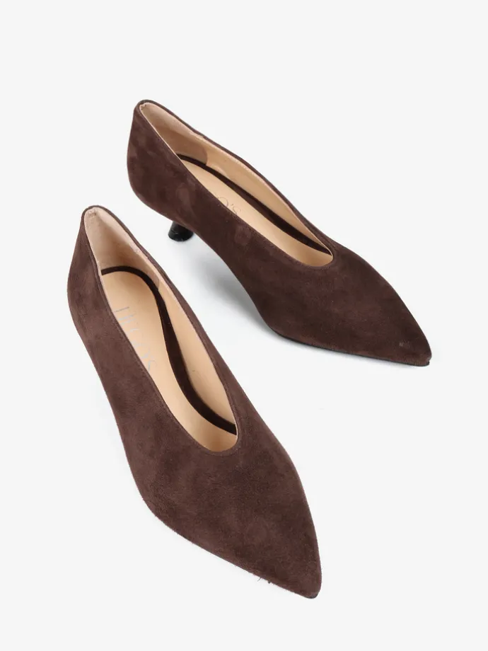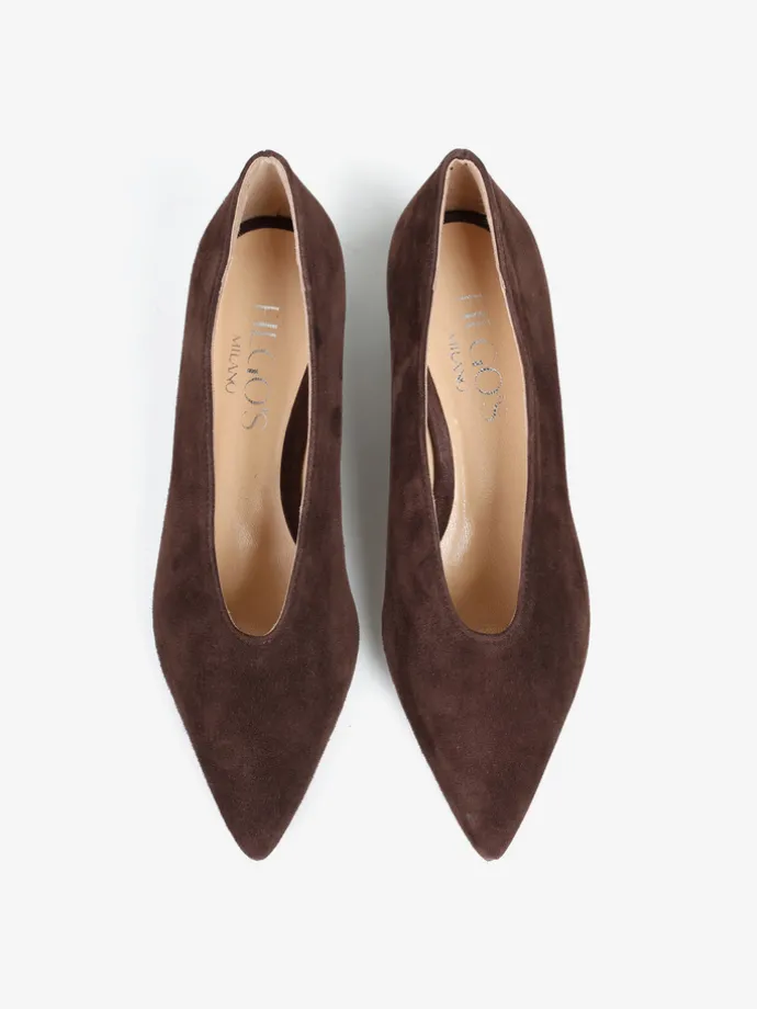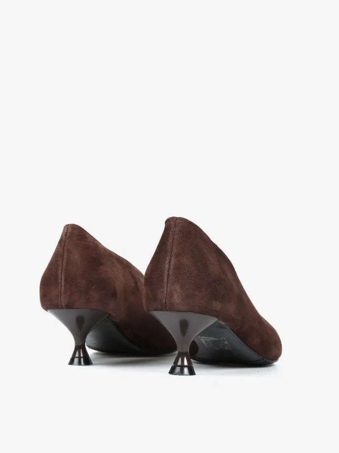 Niskie szpilki wykonane z brązowego zamszu. Noski w szpic i owalne wycięcia z zabudowanymi brzegami.