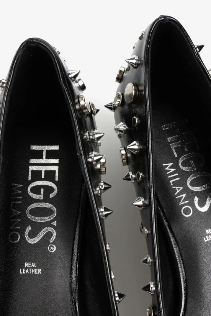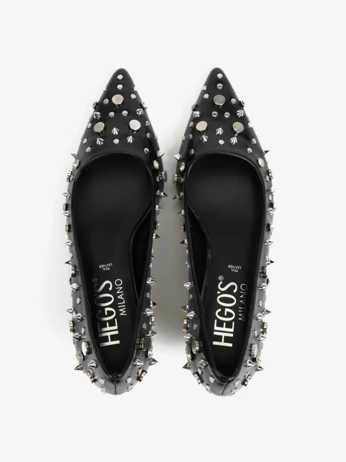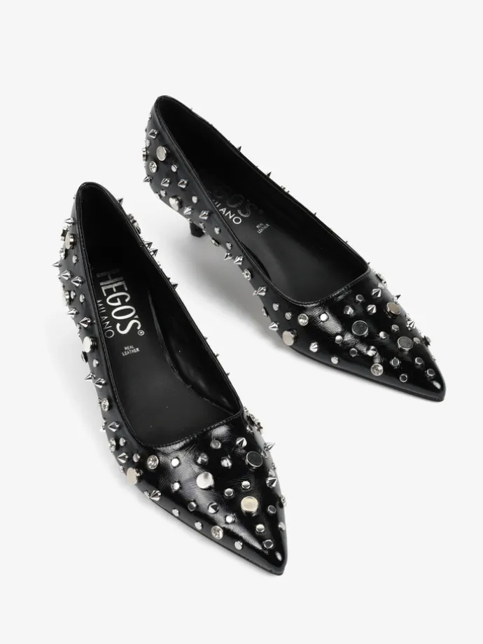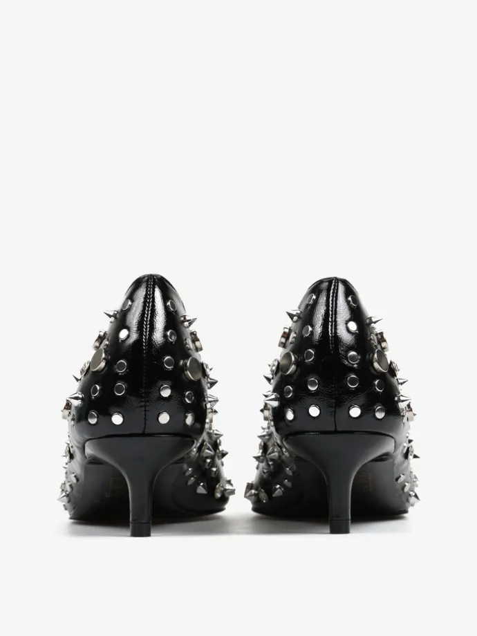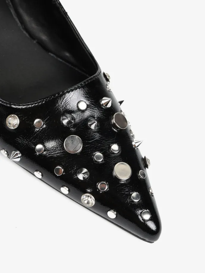 Niskie szpilki z noskami w szpic i kwadratowym wycięciem. Zdobienia z ćwieków o różnych kształtach i rozmiarach.