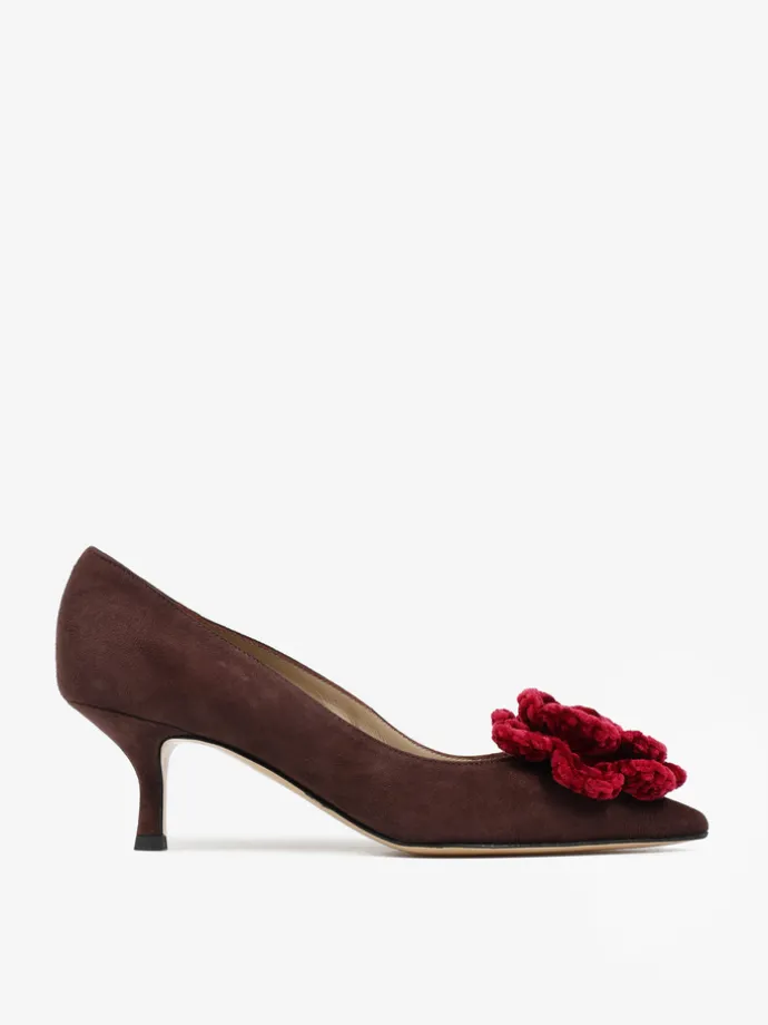 Zamszowe szpilki z noskiem w szpic ozdobione szydełkowym, bordowym kwiatem.
