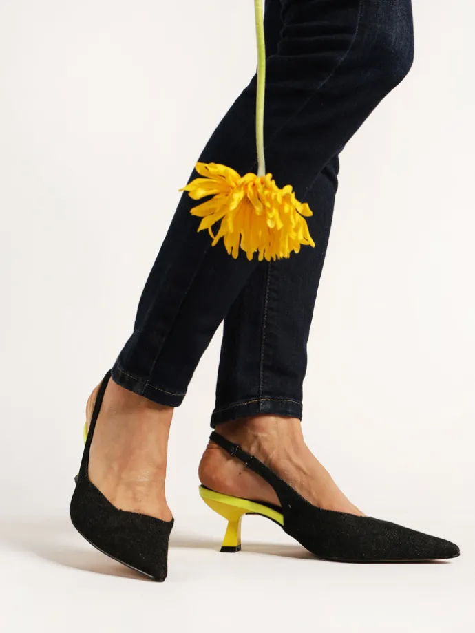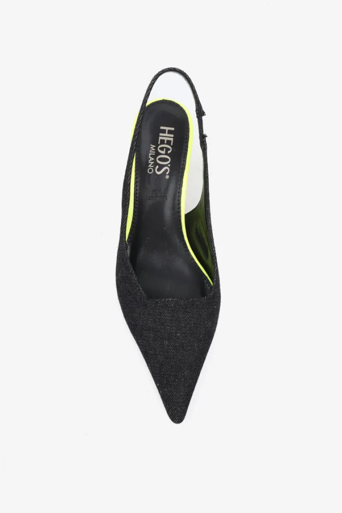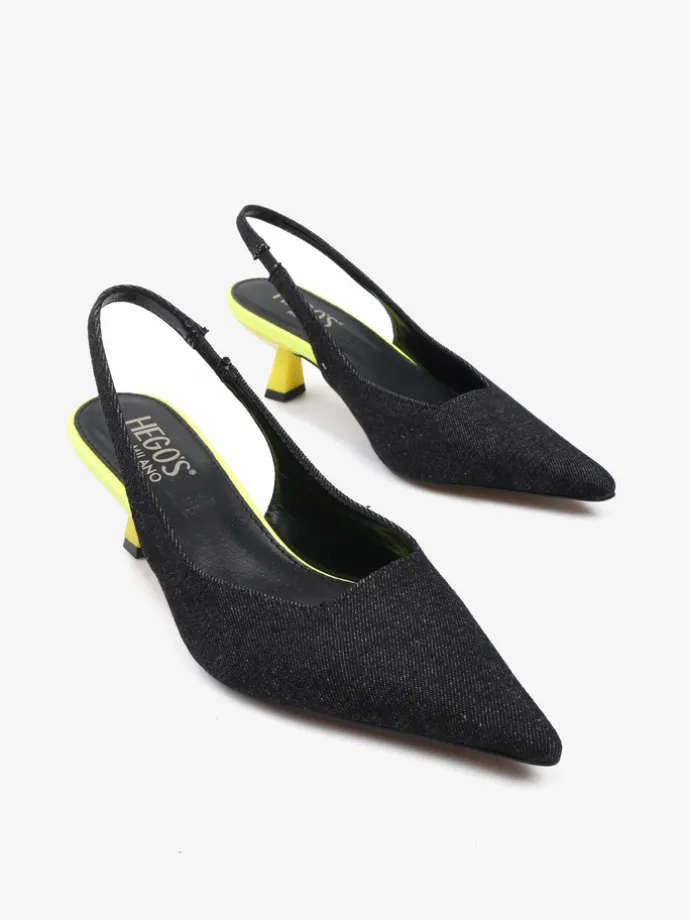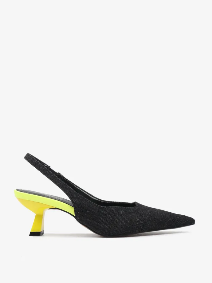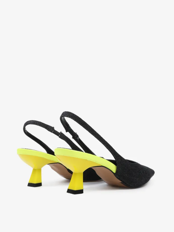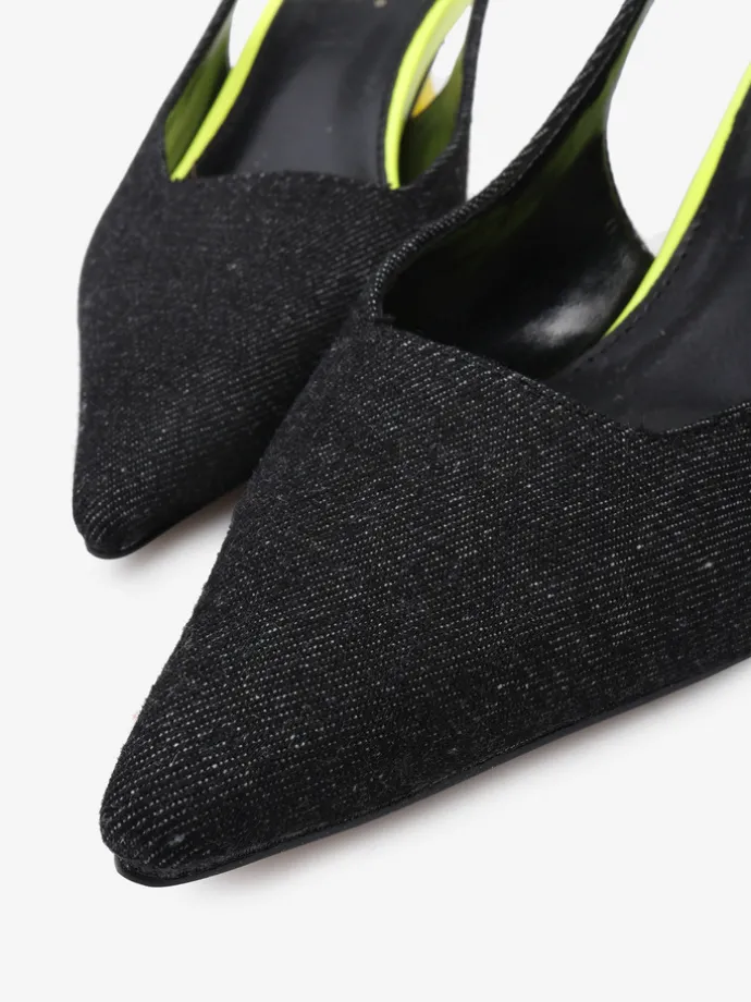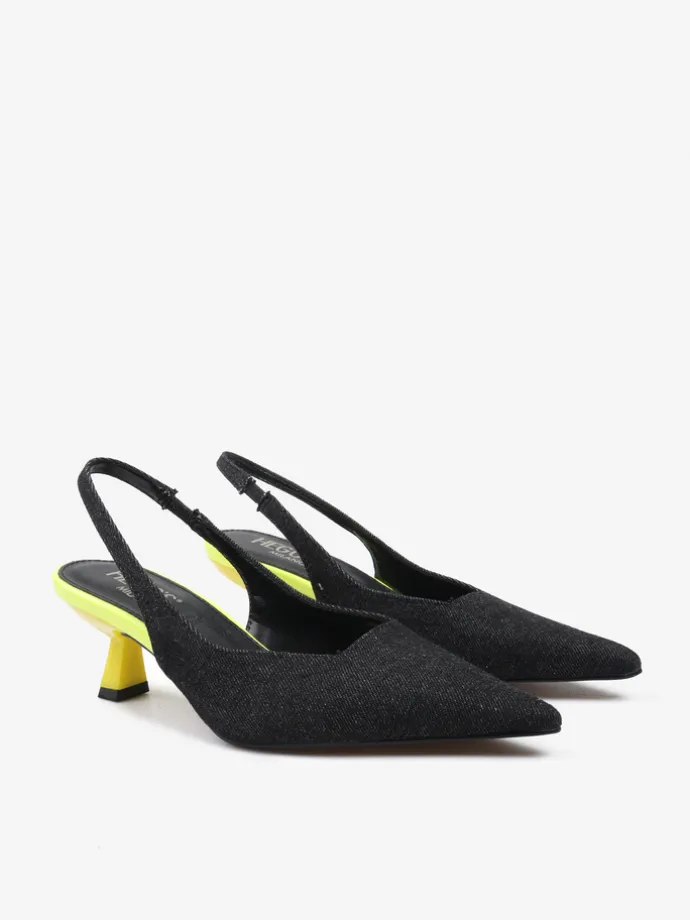 Czółenka z ciemnego jeansu na neonowej szpilce. Nosek w szpic i odkryta pięta z paskiem dopasowującym się do stopy.