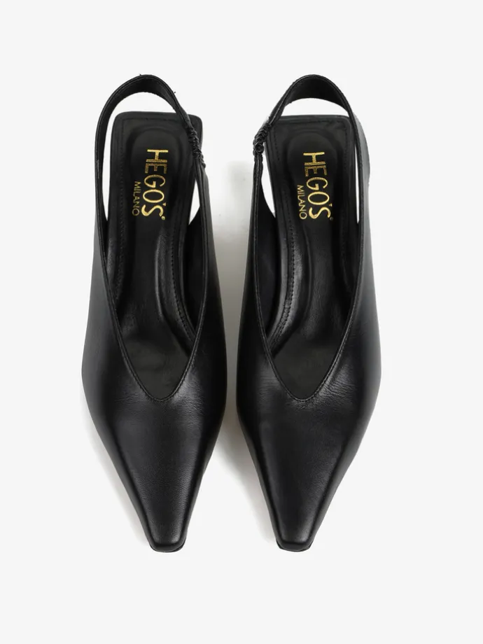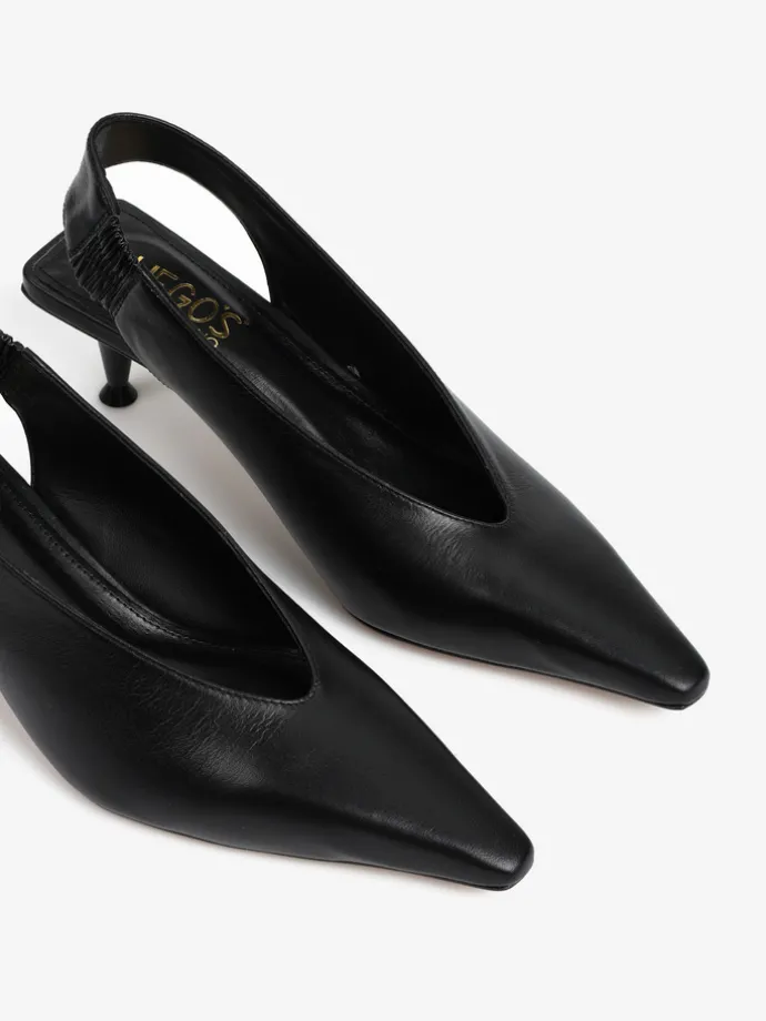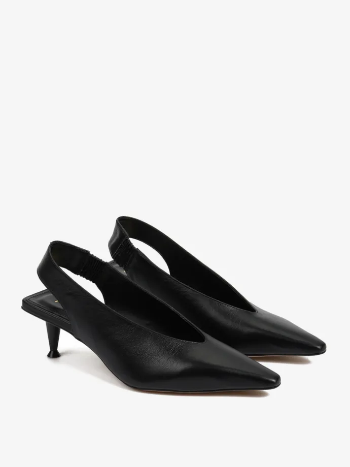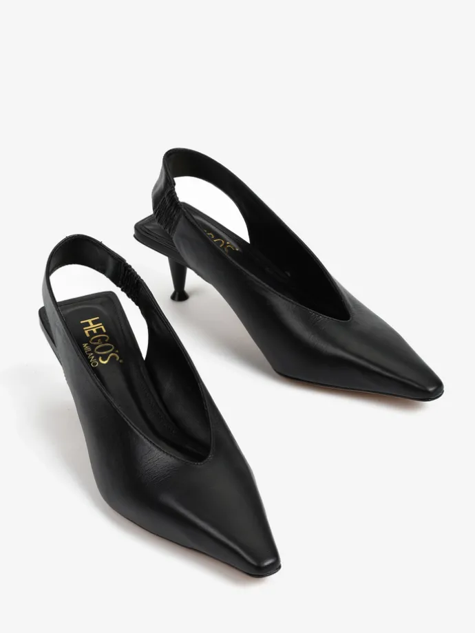 Szpilki z geometrycznym obcasem i wydłużonymi noskami w szpic. Odkryta pięta z elastycznym paskiem.