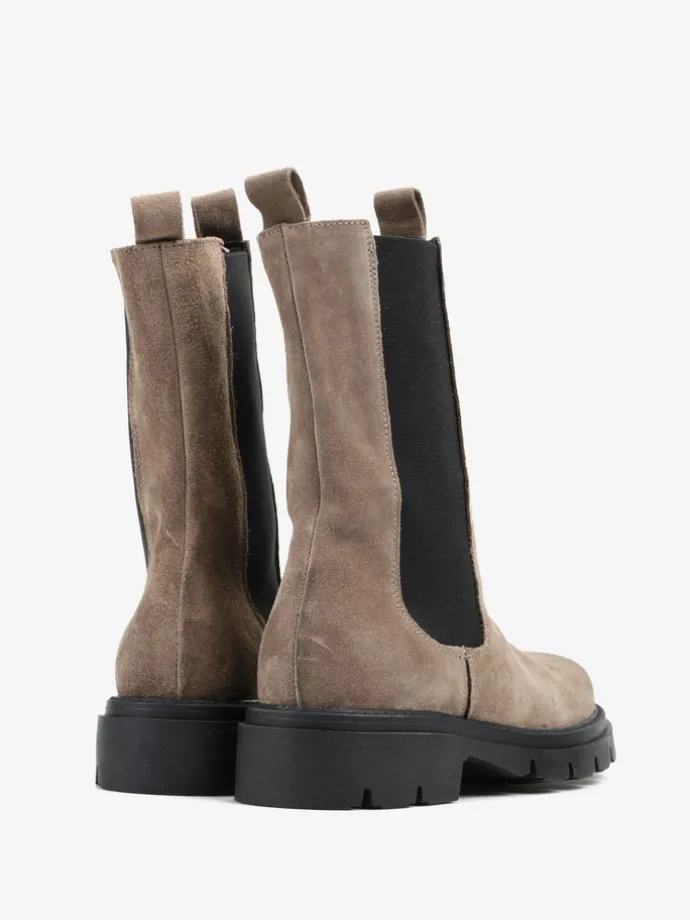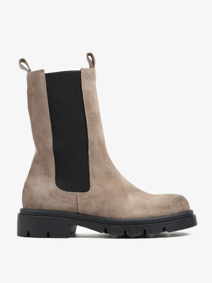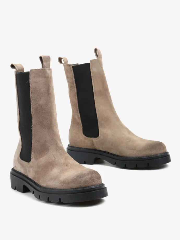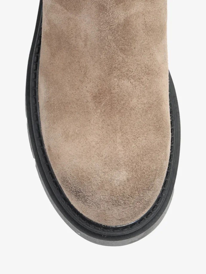 Zamszowe sztyblety na grubszej podeszwie. Wysoka cholewa i okrągły nosek.