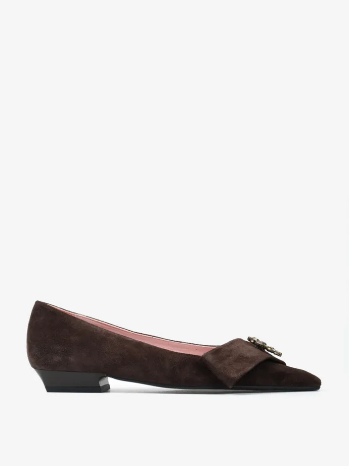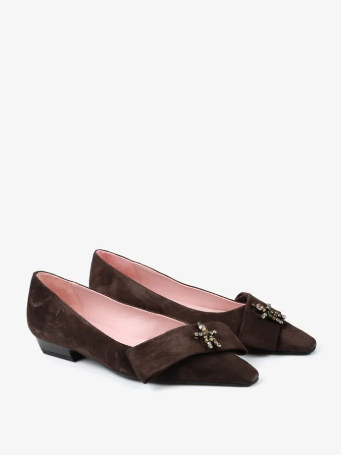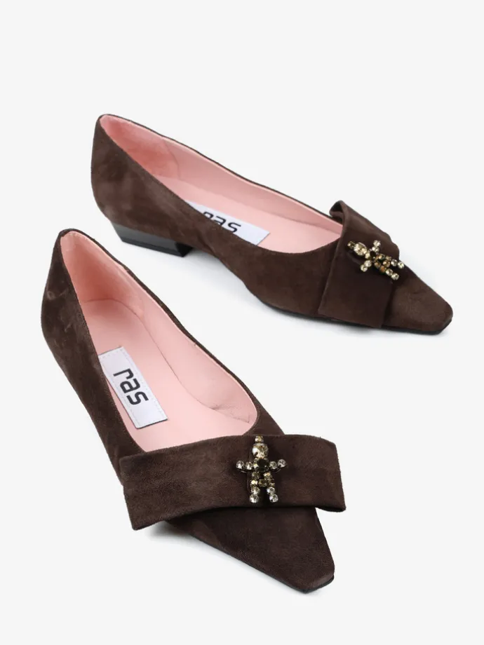 Zamszowe baleriny RAS na niskim obcasie. Nosek w szpic z ozdobnym, zamszowym paskiem i biżuteryjną aplikacją.