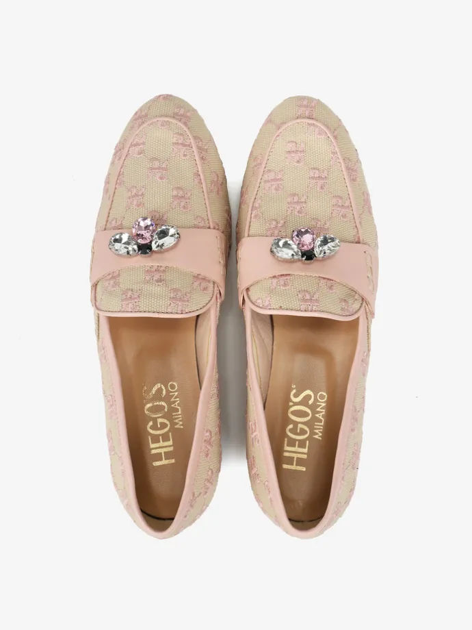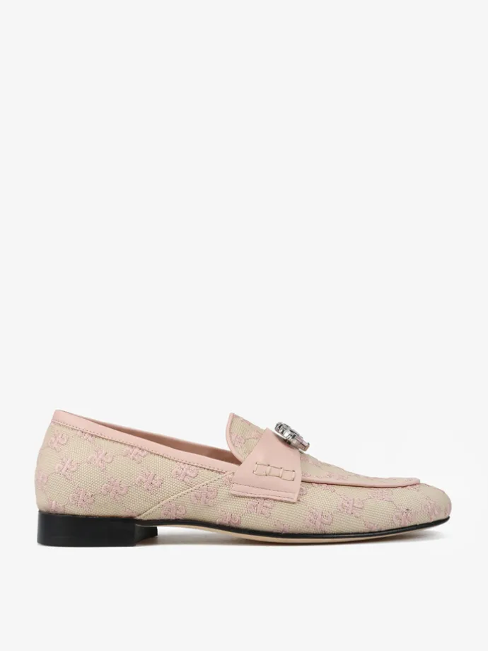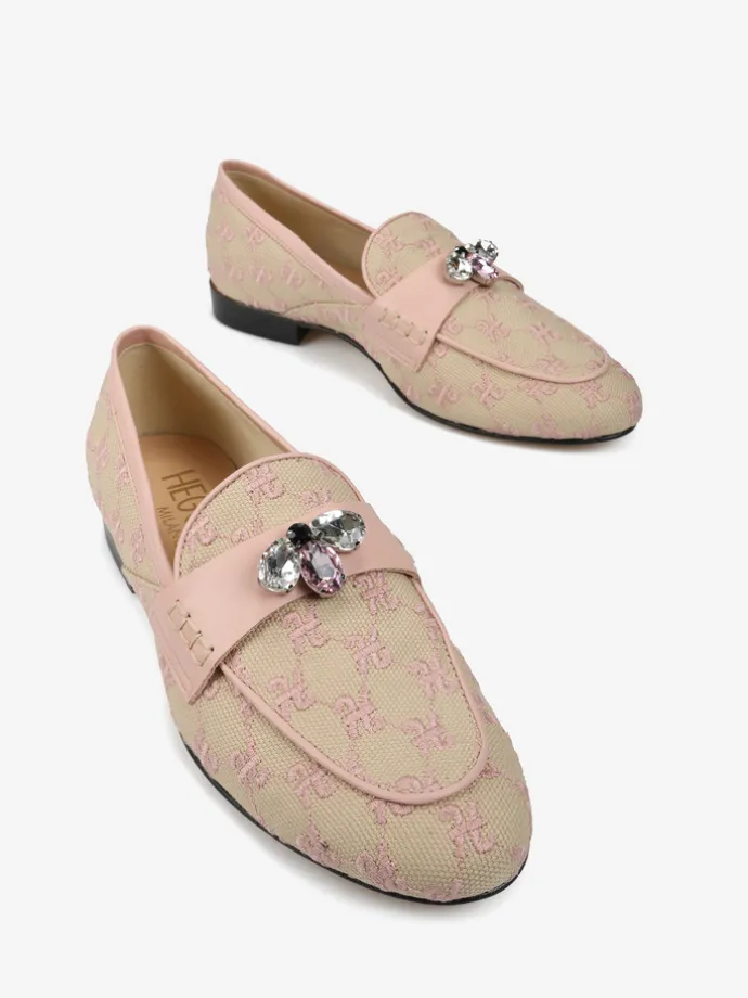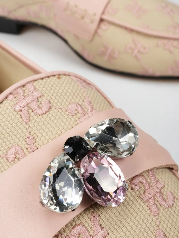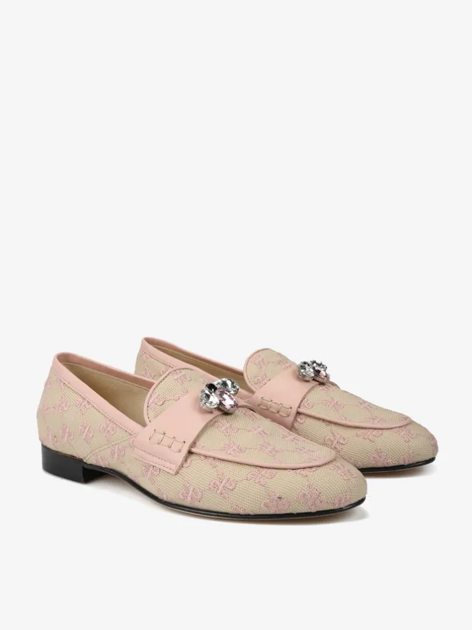 Mokasyny z haftowanym monogramem, skórzanymi przeszyciami i biżuteryjną aplikacją.