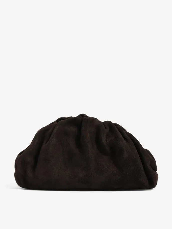 Mała torebka do ręki zamykana na zatrzask, wykonana z zamszu. Dodatkowy, odczepiany łańcuszek do noszenia na ramieniu.