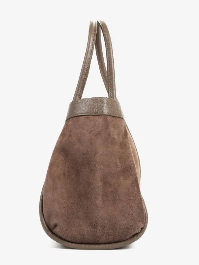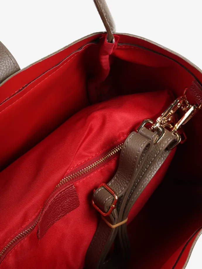 Elegancka torebka wykonana z wysokiej jakości zamszu z elementami skóry licowej. Wewnątrz znajduje się wyjmowana kosmetyczka, a dzięki łańcuszkowi można zmienić kształt torebki. Czerwone wnętrze dodaje jej wyjątkowego charakteru, a pojemność zapewnia komfort użytkowania na co dzień.