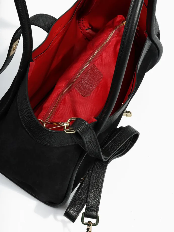 Elegancka torebka wykonana z wysokiej jakości zamszu z elementami skóry licowej. Wewnątrz znajduje się wyjmowana kosmetyczka, a dzięki łańcuszkowi można zmienić kształt torebki. Czerwone wnętrze dodaje jej wyjątkowego charakteru, a pojemność zapewnia komfort użytkowania na co dzień.