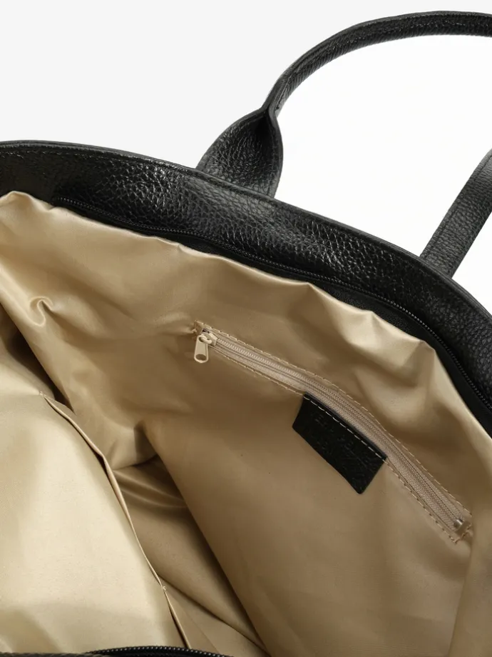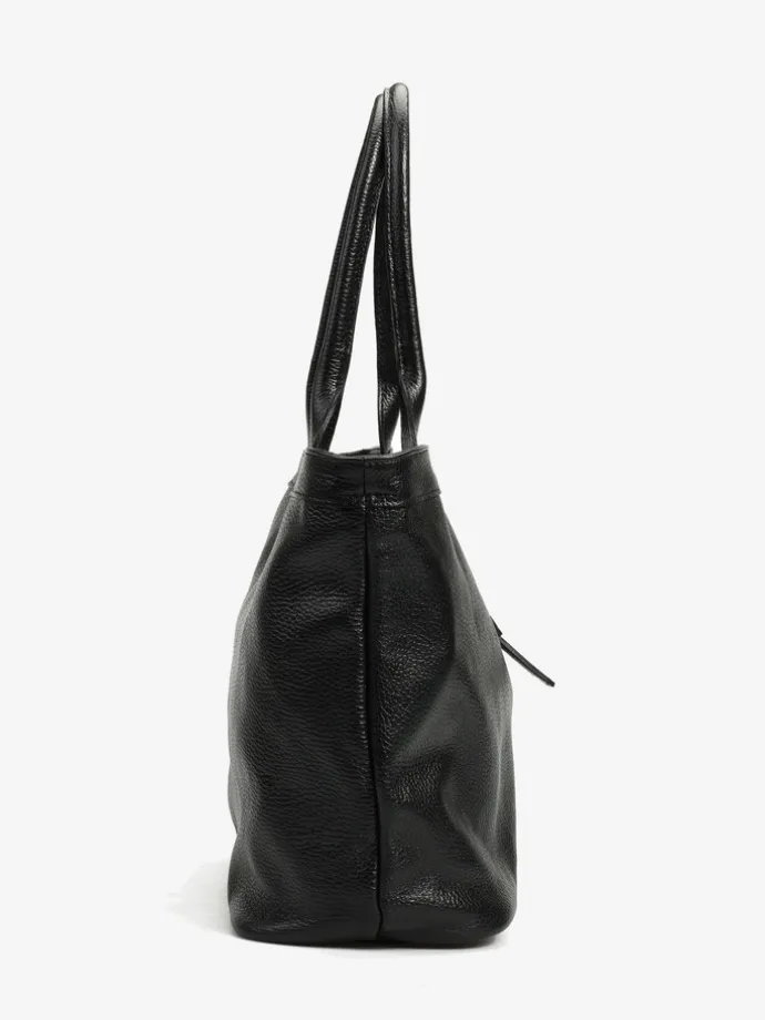 Skórzany shopper z ozdobnym zapięciem w kształcie litery H – jak HEGO’S MILANO. Dzięki wewnętrznemu haczykowi torba może być noszona na dwa sposoby, zmieniając swój kształt. Dodatkowe zapięcie na suwak i wewnętrzna kieszonka.