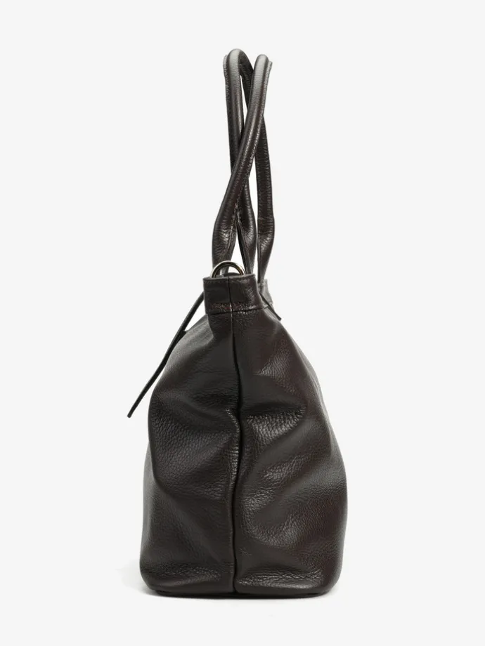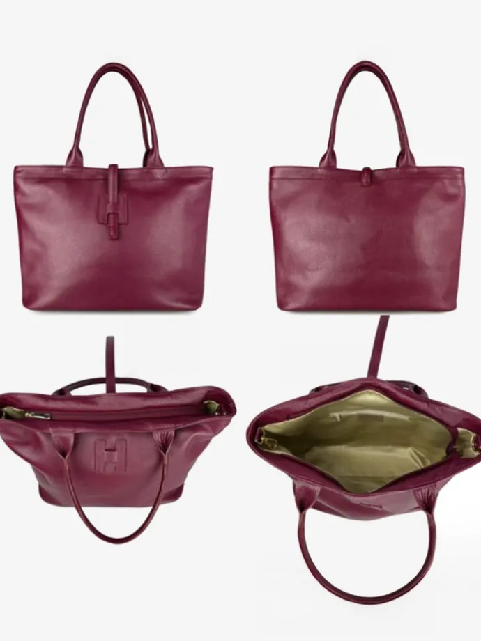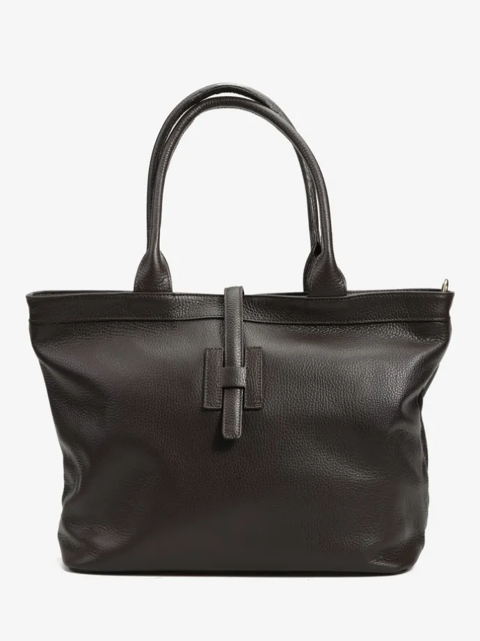 Skórzany shopper z ozdobnym zapięciem w kształcie litery H – jak HEGO’S MILANO. Dzięki wewnętrznemu haczykowi torba może być noszona na dwa sposoby, zmieniając swój kształt. Dodatkowe zapięcie na suwak i wewnętrzna kieszonka.