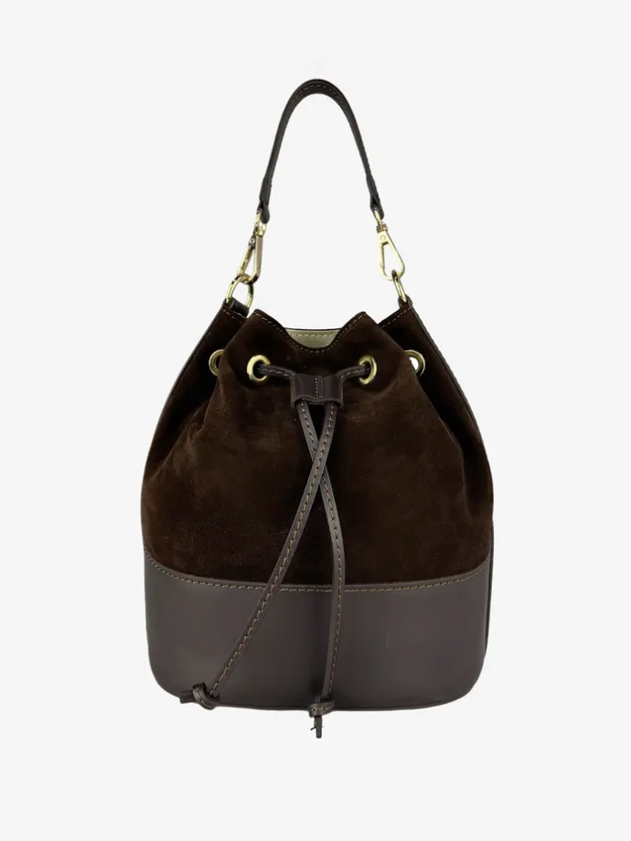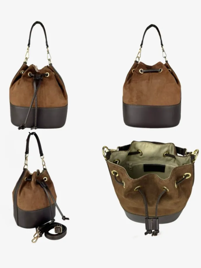 Torebka-worek wykonana z połączenia skóry naturalnej i zamszu. Dodatkowy, regulowany pasek do noszenia na ramieniu. W środku kieszonka zapinana na suwak.