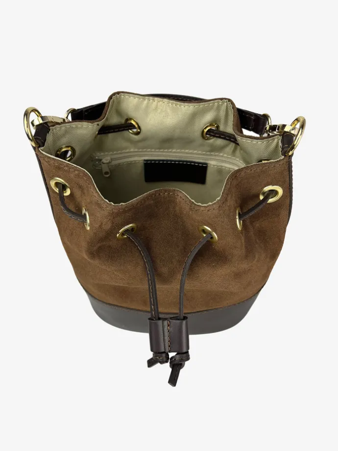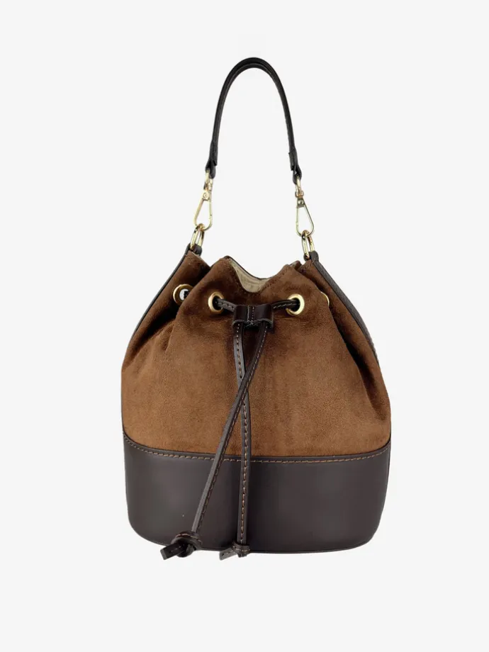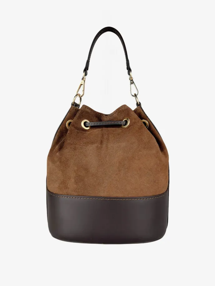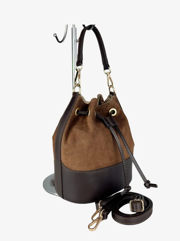 Torebka-worek wykonana z połączenia skóry naturalnej i zamszu. Dodatkowy, regulowany pasek do noszenia na ramieniu. W środku kieszonka zapinana na suwak.
