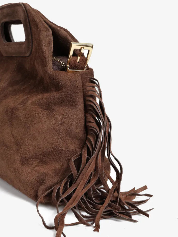 Zamszowa torebka do ręki z zapięciem na suwak i ozdobnymi frędzlami. Dodatkowy pasek do noszenia na ramię.