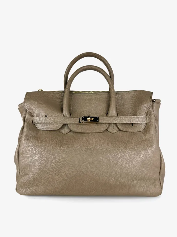 Beżowa torba z ozdobną klapą i złotym zapięciem. Dodatkowy, regulowany pasek do noszenia na ramieniu.
