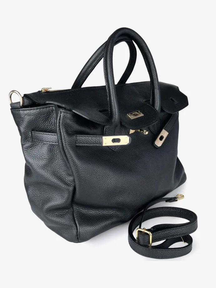 Czarna torba z ozdobną klapą i złotym zapięciem. Dodatkowy, regulowany pasek do noszenia na ramieniu.