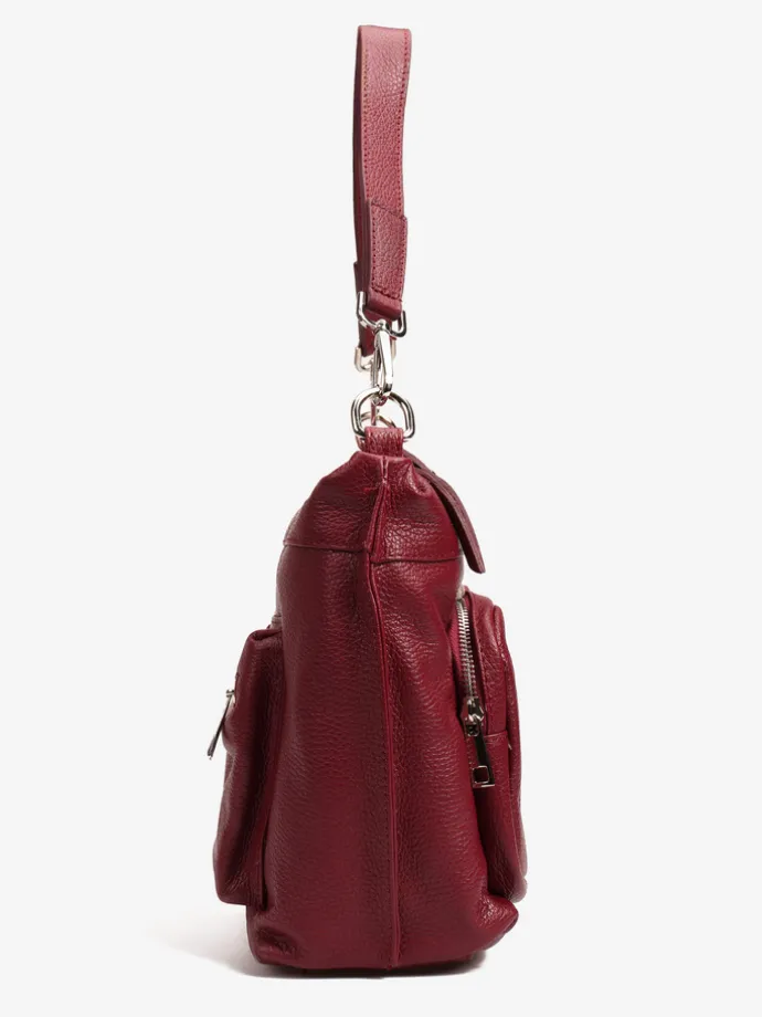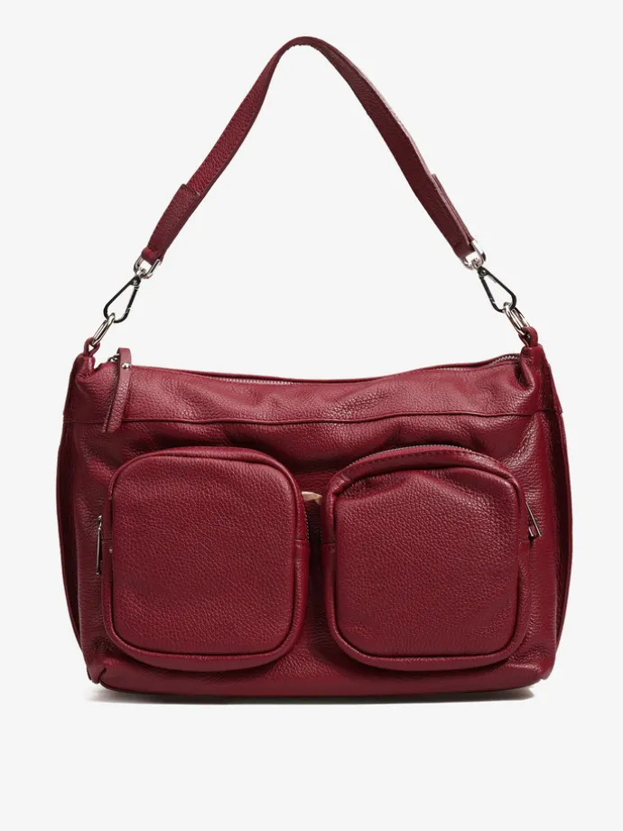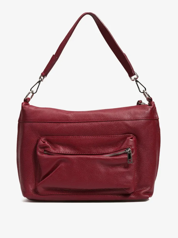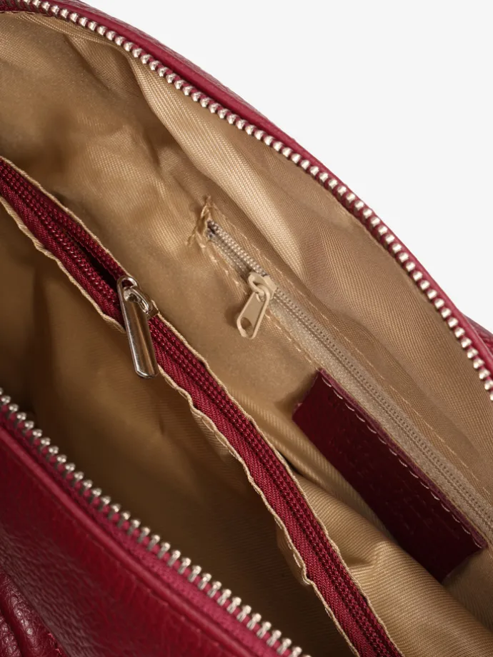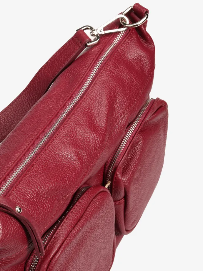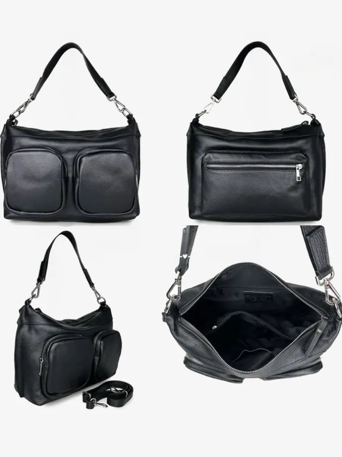 Praktyczna, skórzana torebka z kieszonkami zapinanymi na suwak i wewnętrznymi przegródkami. Dodatkowy, regulowany pasek.