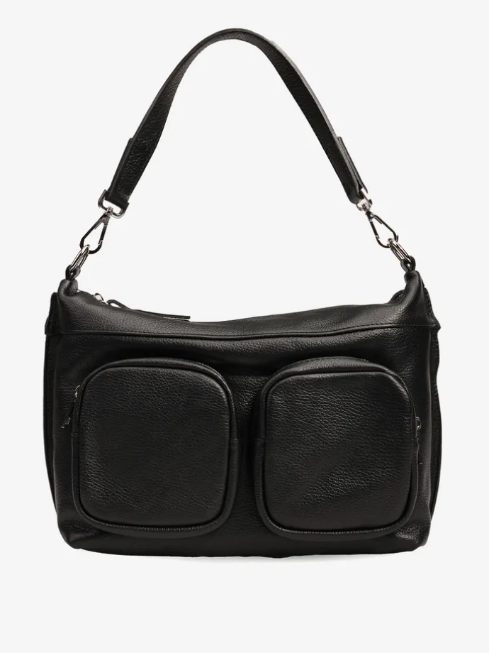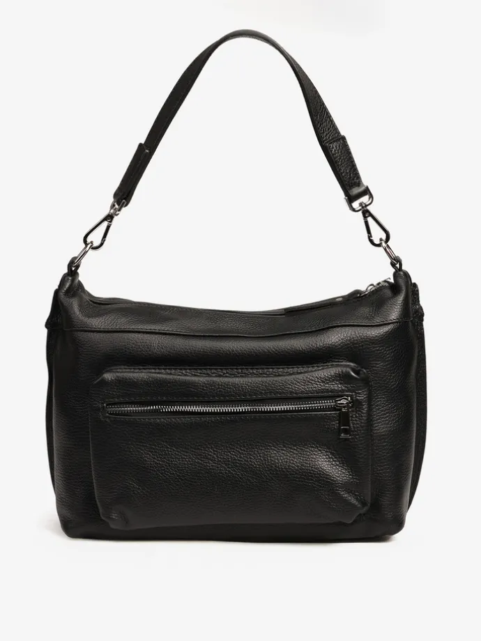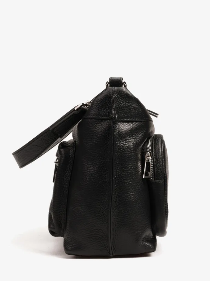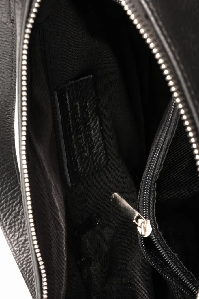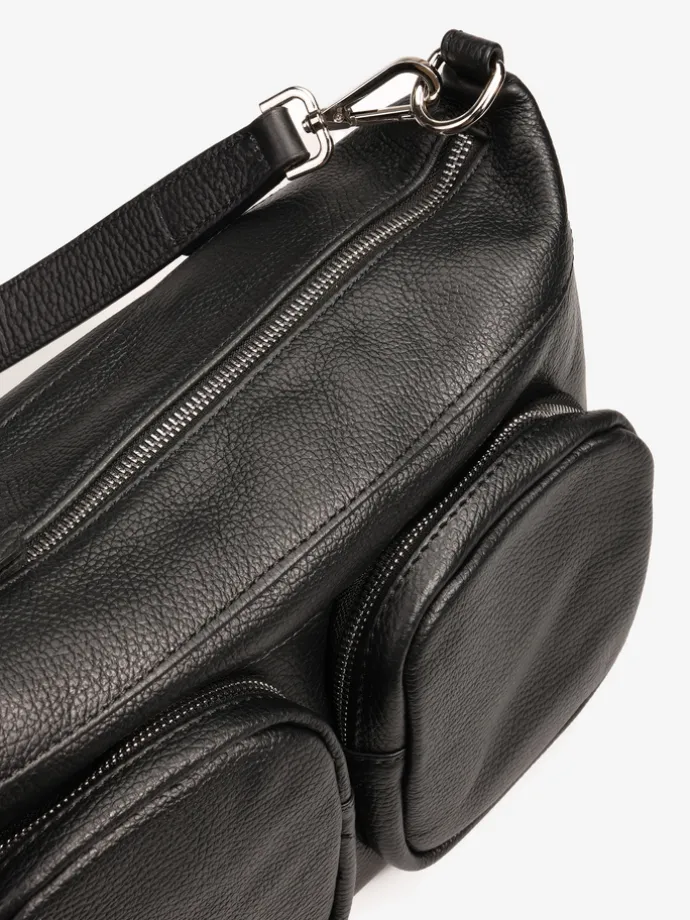 Praktyczna, skórzana torebka z kieszonkami zapinanymi na suwak i wewnętrznymi przegródkami. Dodatkowy, regulowany pasek.