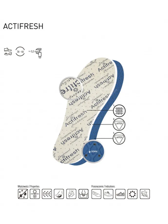 Wkładka antybakteryjna o świeżym zapachu składająca się z trzech warstw: bawełnianej tkaniny wierzchniej, pianki lateksowej ze środkiem przeciwbakteryjnym zapobiegającym rozwojowi drobnoustrojów w wilgotnym i ciepłym środowisku buta oraz przeciwpoślizgowej pianki lateksowej, z fakturą rombów. Perforacja zapewnia cyrkulację powietrza, która daje poczucie komfortu.