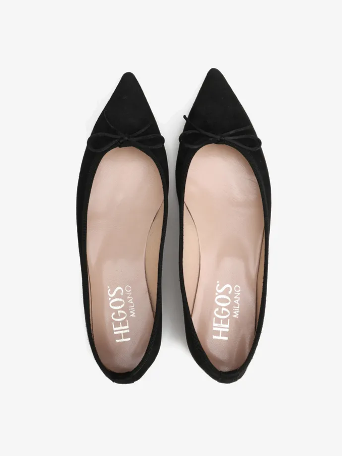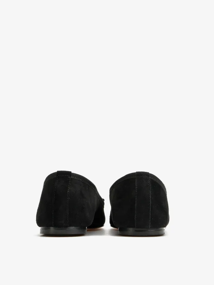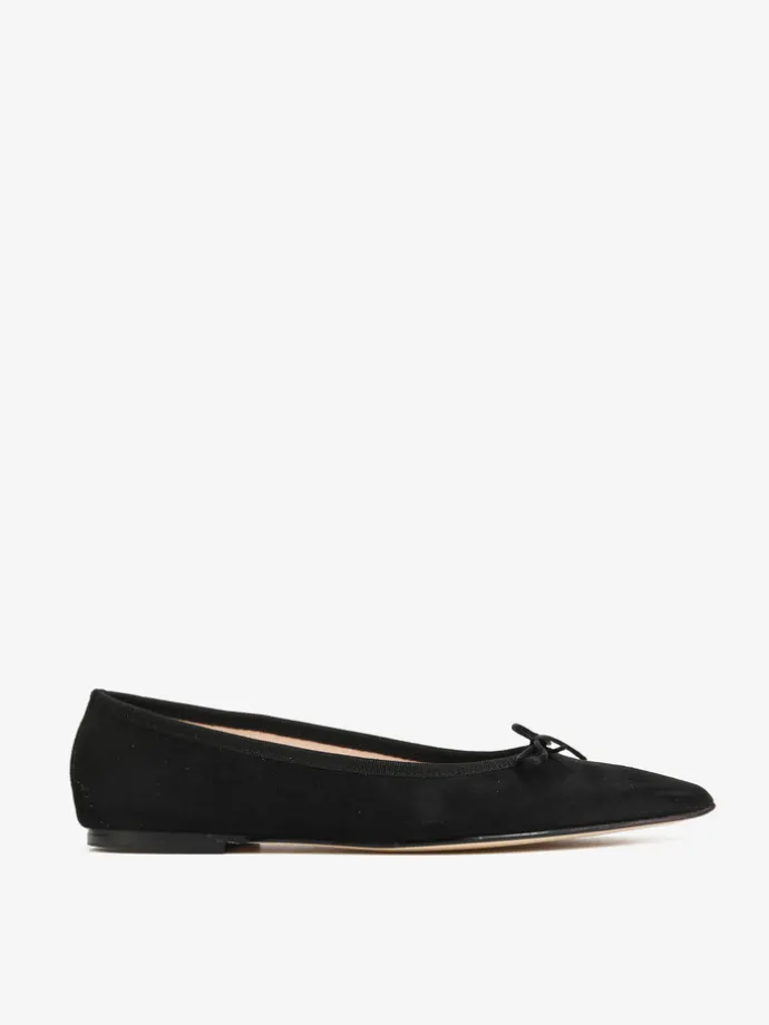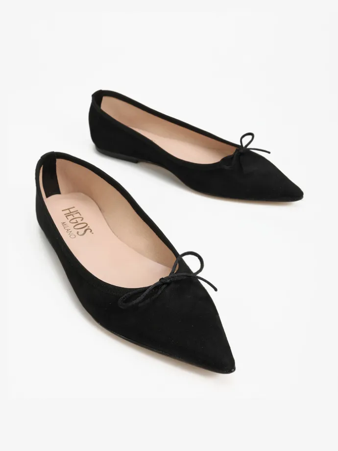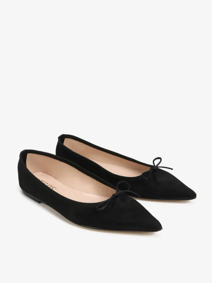 Baleriny z noskiem w szpic wykonane z modnego w tym sezonie zamszu. Wiązana kokardka umożliwia regulację dopasowania.