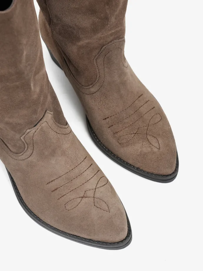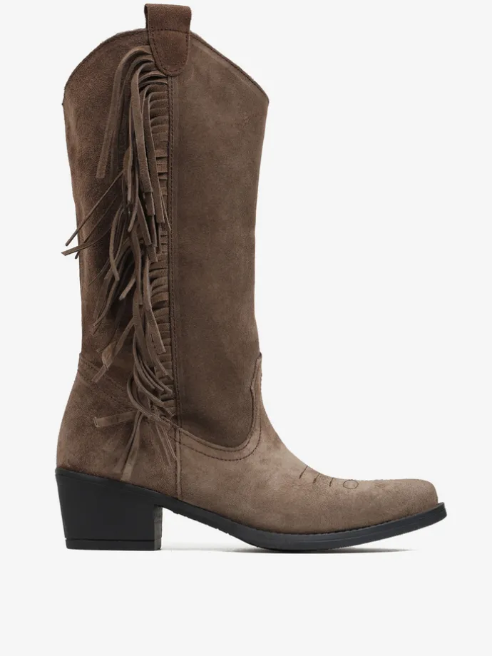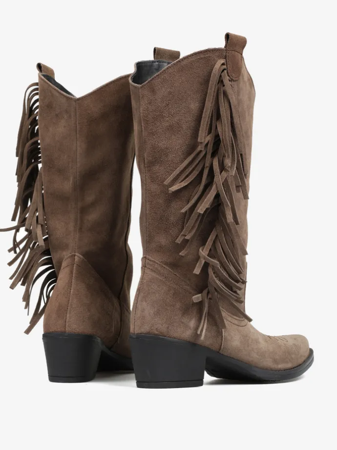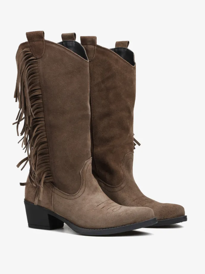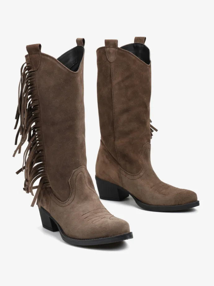 Wsuwane, zamszowe kowbojki z haftem na nosku i ozdobnymi frędzlami.