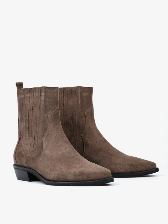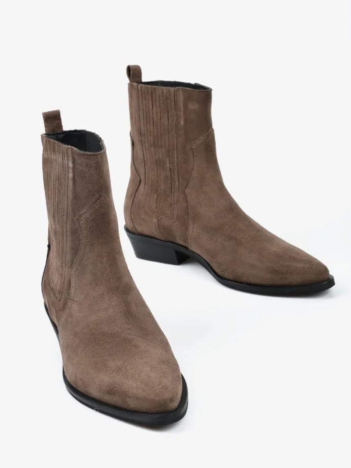 Klasyczne kowbojki wykonane z zamszu w kolorze taupe.