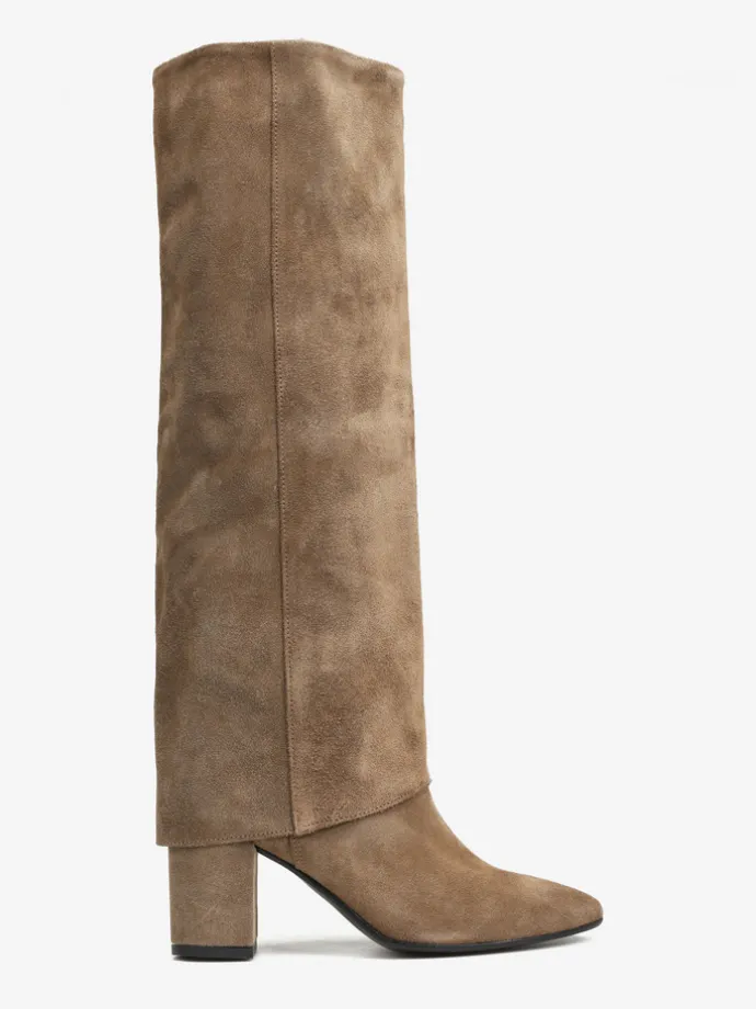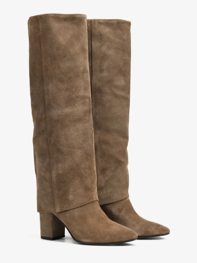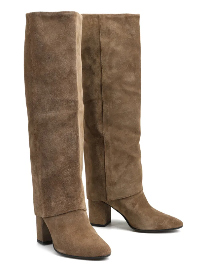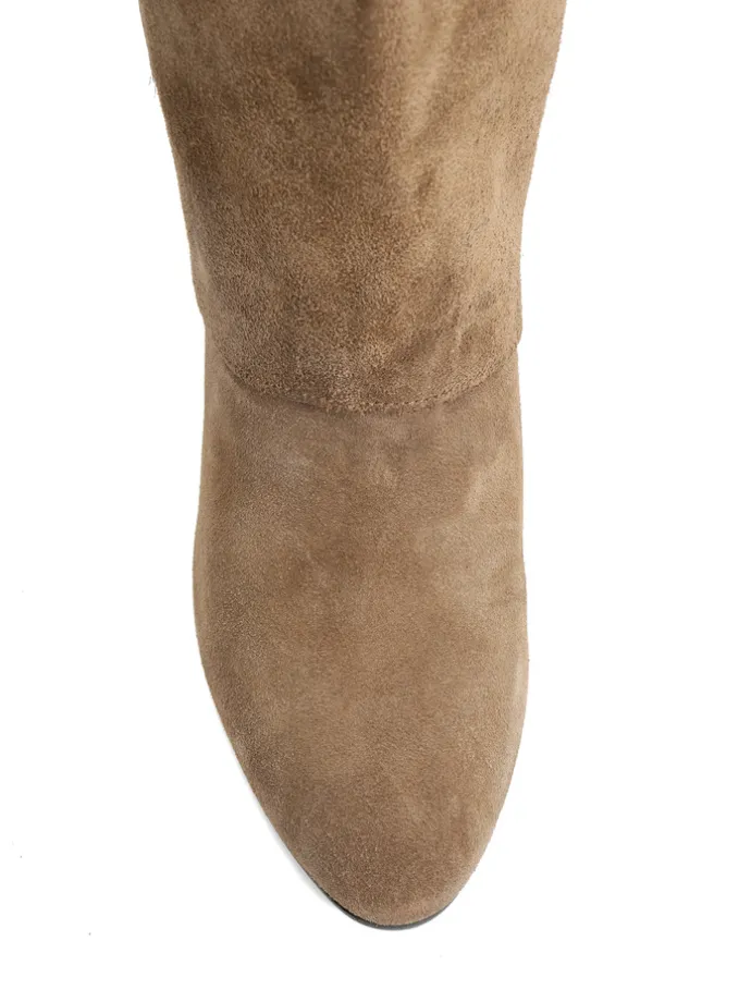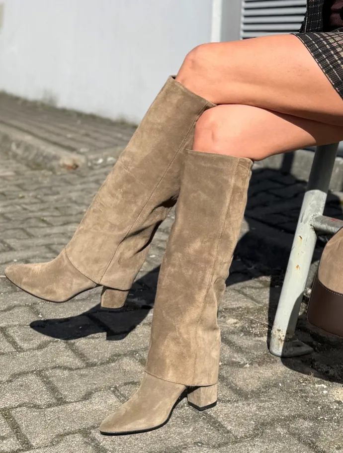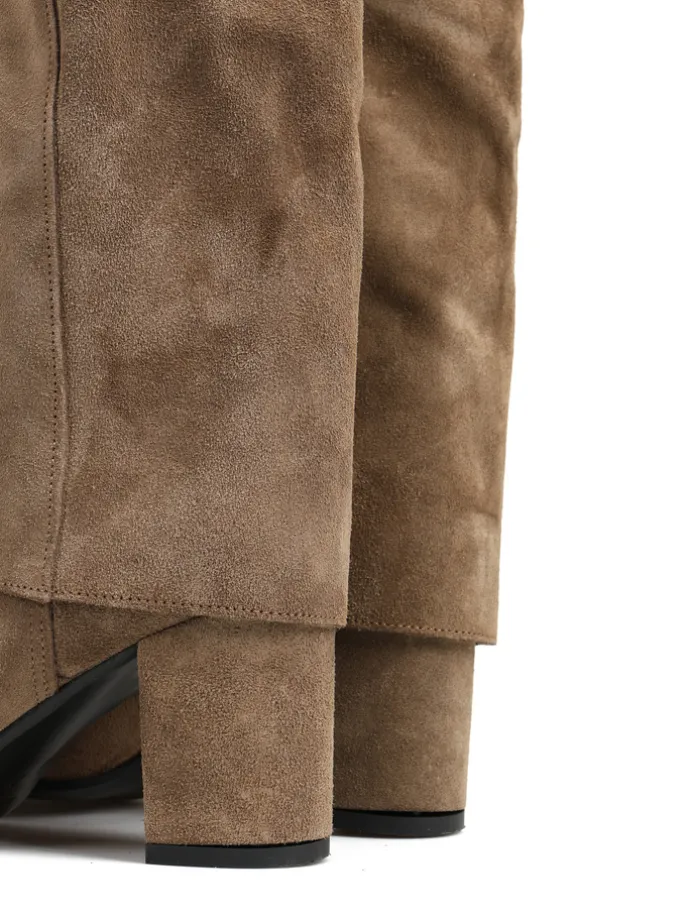 Zamszowe, wsuwane kozaki na stabilnym słupku. Przedłużona cholewka.