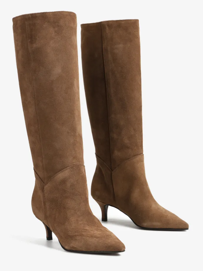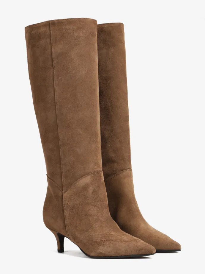 Zamszowe kozaki na niskiej szpilce. Noski w szpic i cholewka z ozdobnymi przeszyciami.