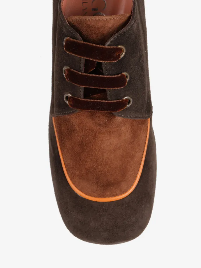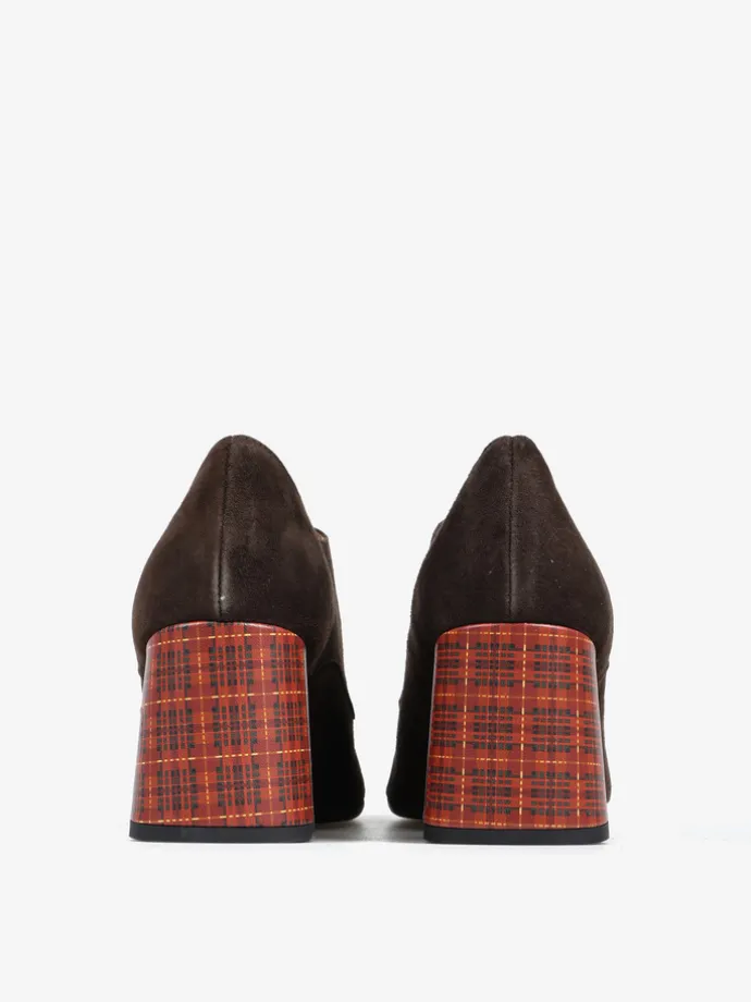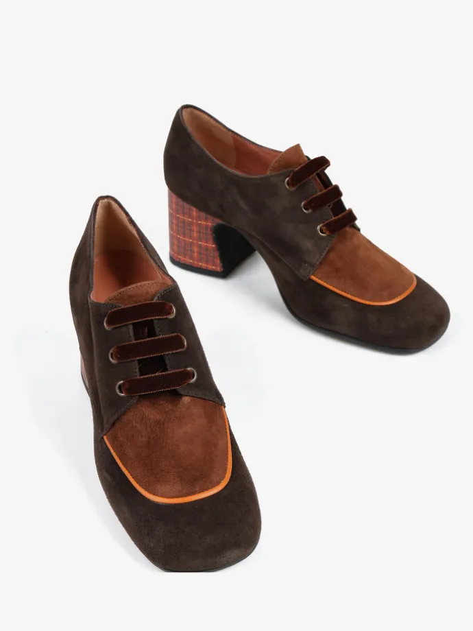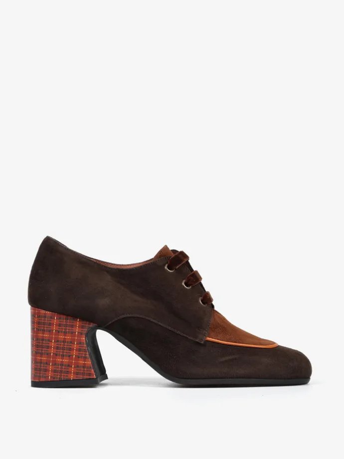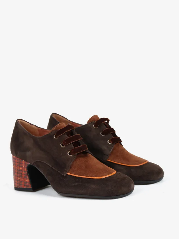 Zamszowe półbuty na wzorzystym słupku. Welurowe sznurowadła i kwadratowe noski z kontrastującą lamówką.