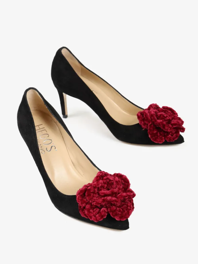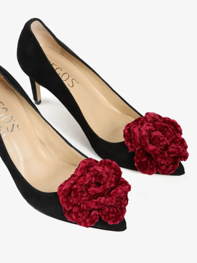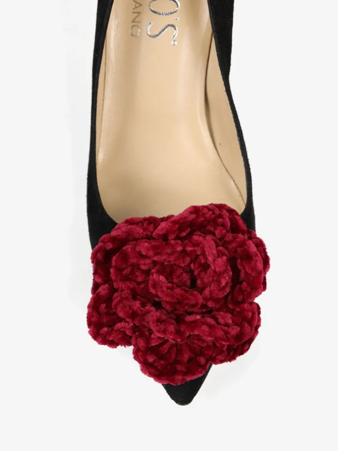 Zamszowe szpilki z noskiem w szpic ozdobione szydełkowym, bordowym kwiatem.