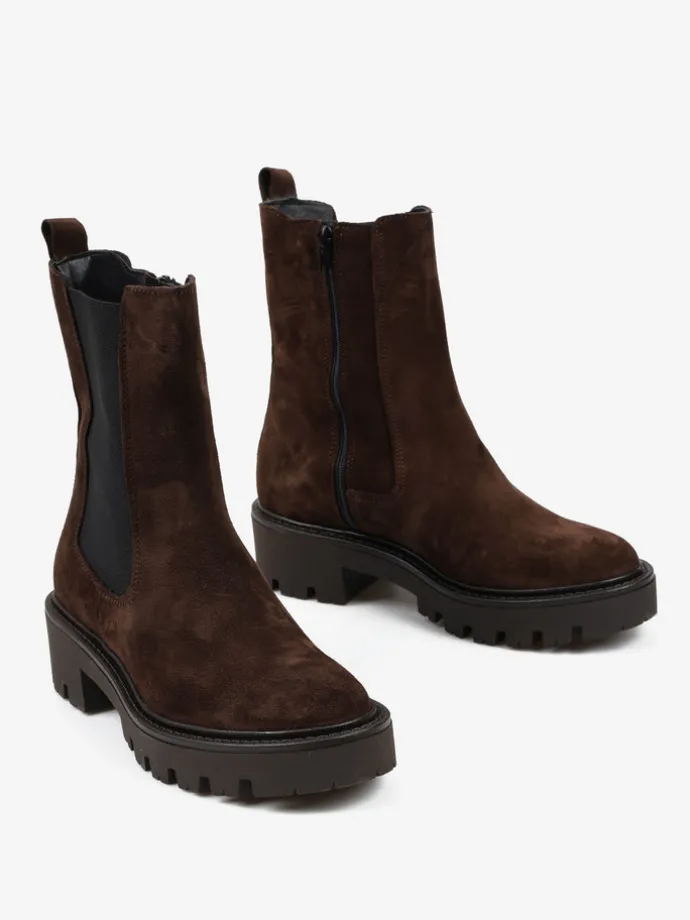 Klasyczne, zamszowe sztyblety na podwyższonej podeszwie.